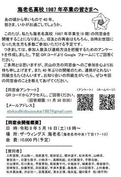 海老名高校 第6期生 学年同窓会に関する情報をお伝えします。2026年5月16日(土) に、ザ・ウィングス海老名にて開催します。現在、約150名ほどの参加希望を頂いています。詳細(リンク)